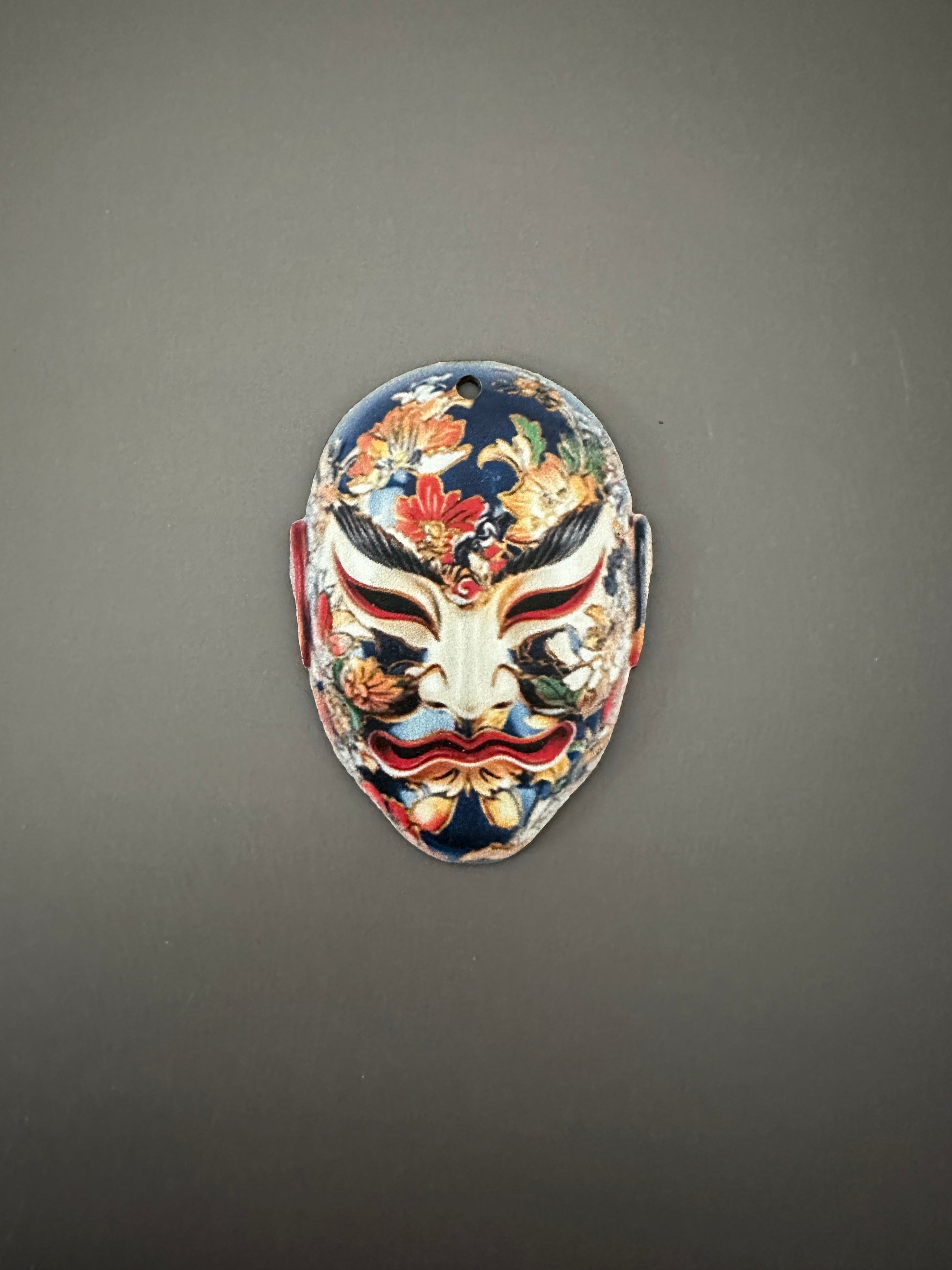 Flat (two-dimensional) wooden mask with Chinese opera-inspired detailing, rich colors, and floral accents for striking presence.