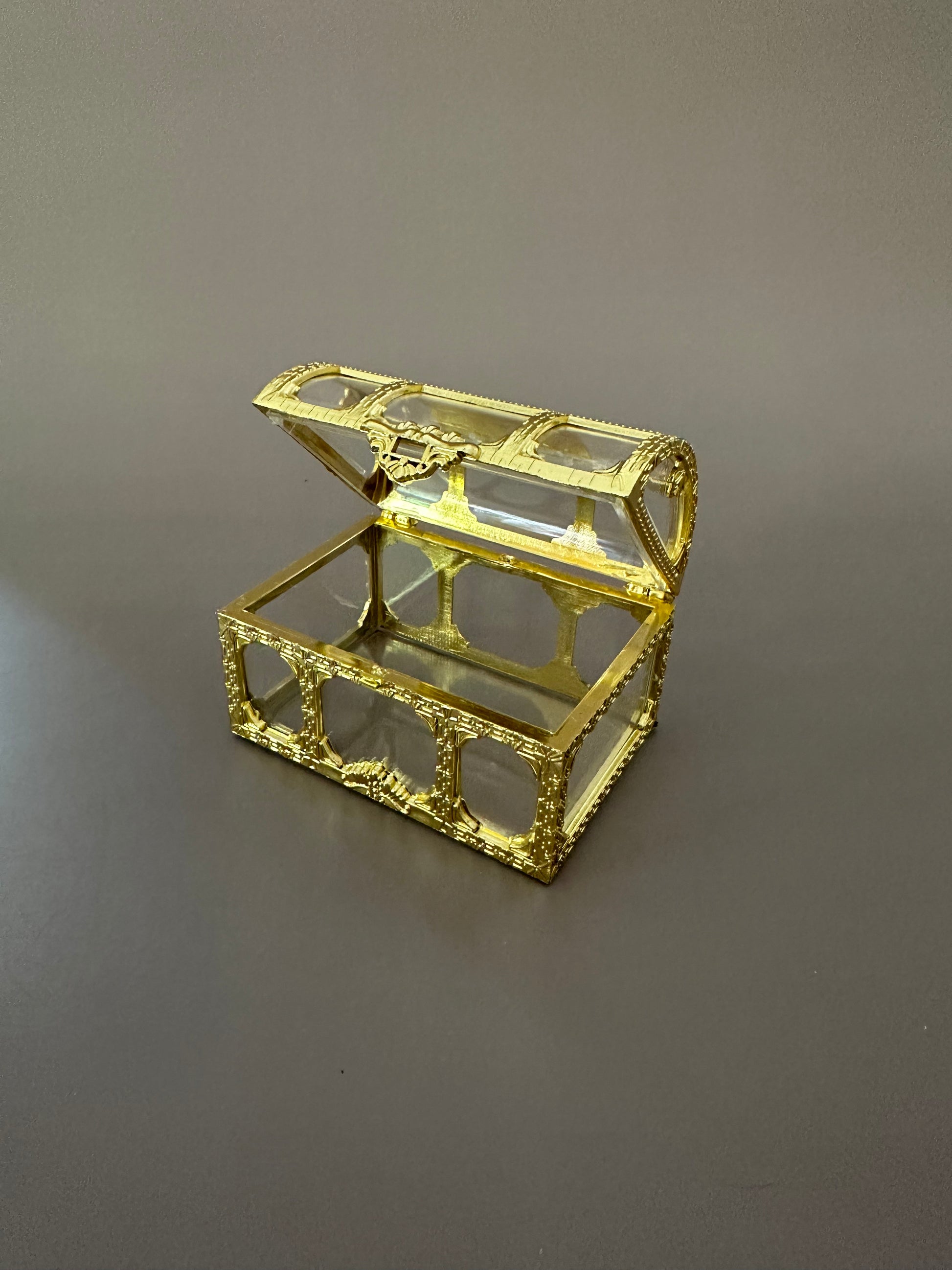 A charming little chest with clear panels framed in ornate golden detail — perfect for holding tiny treasures.