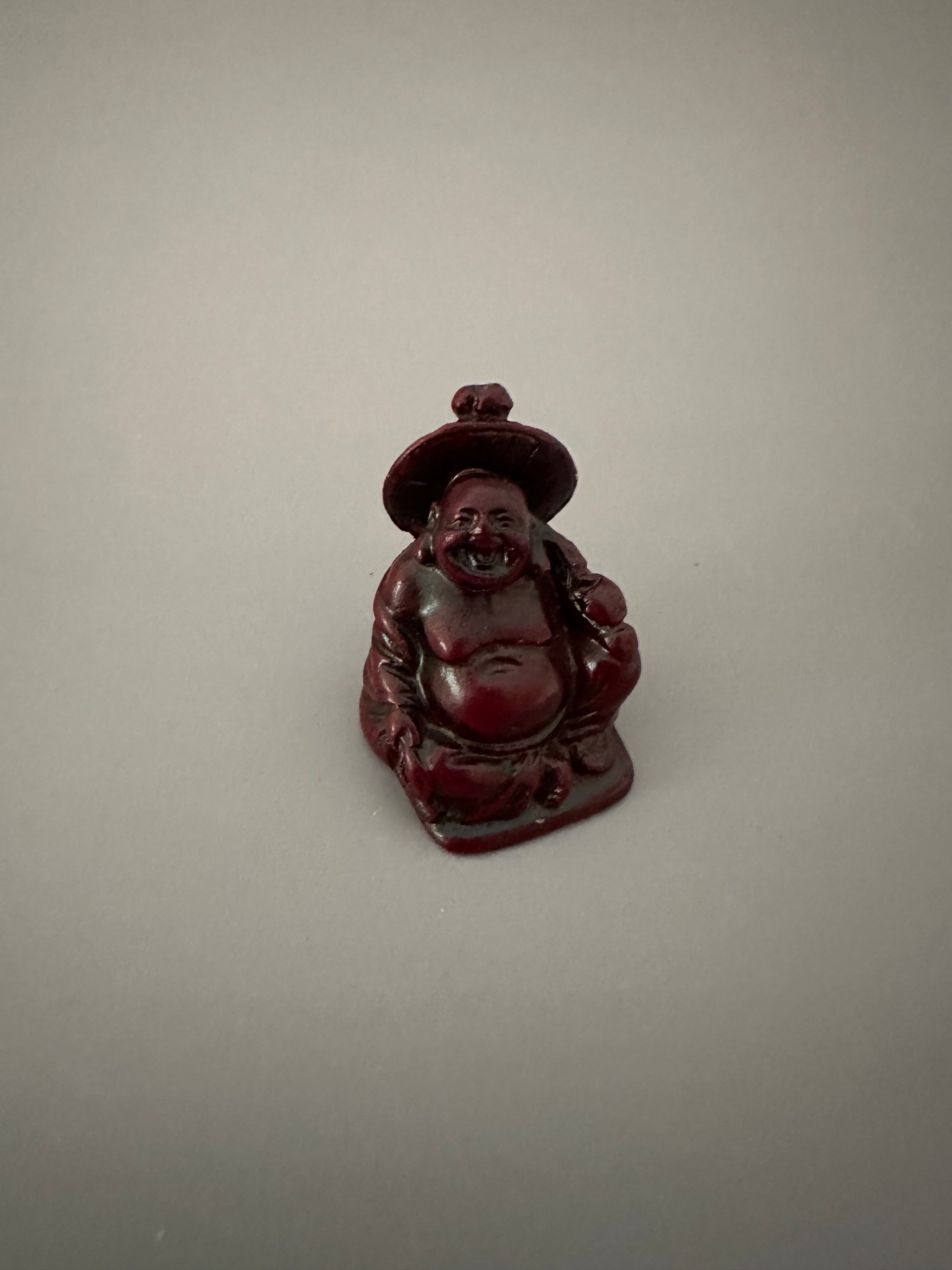 Carved wooden figure of the Laughing Buddha, often seen as a sign of abundance and fortune.