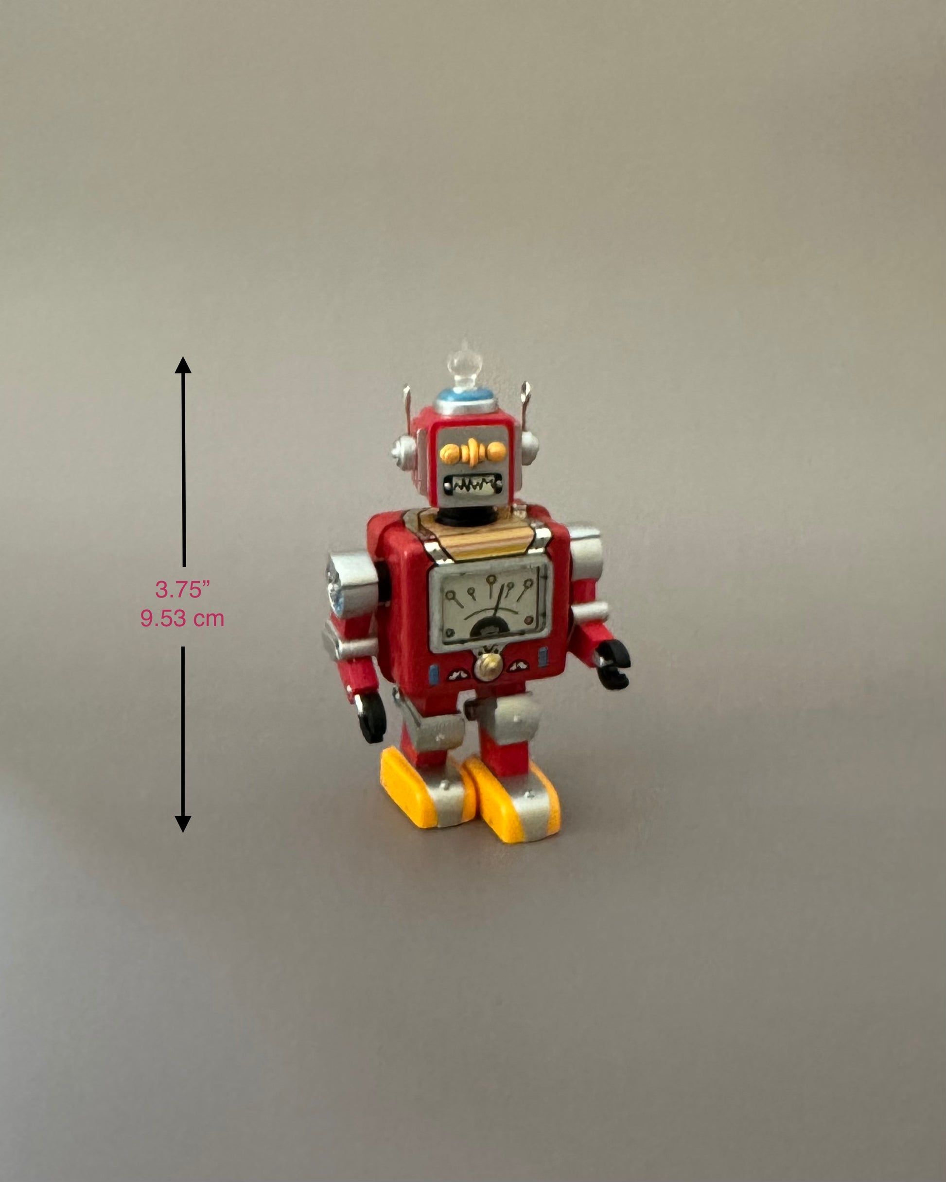 This painted metal figure depicts a classic retro-style robot in bright red, yellow, and silver tones, with a dial on its chest and playful details like antennae and moving parts. Compact and full of character, it adds a touch of nostalgic charm and works well for sandtray therapy, play therapy, display, or as a collectible piece.