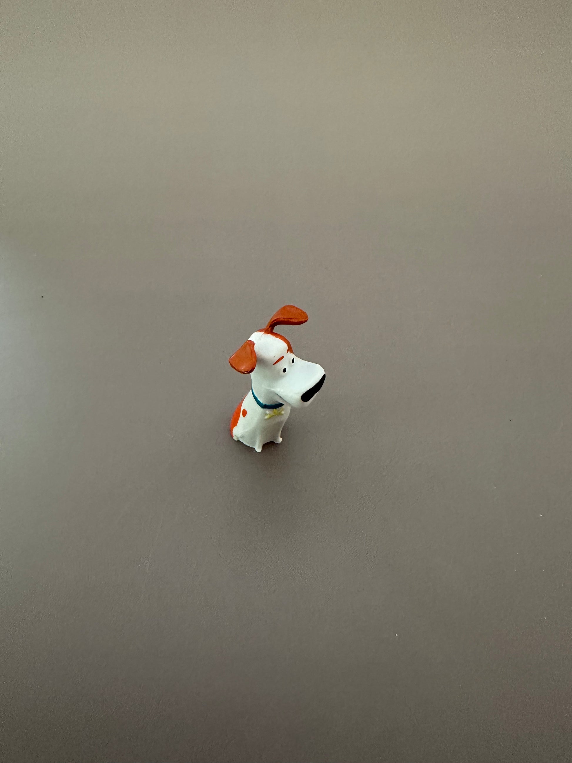 A white pup with floppy brown ears and playful spots, captured in a tall, upright pose — a fun little collectible with plenty of charm.