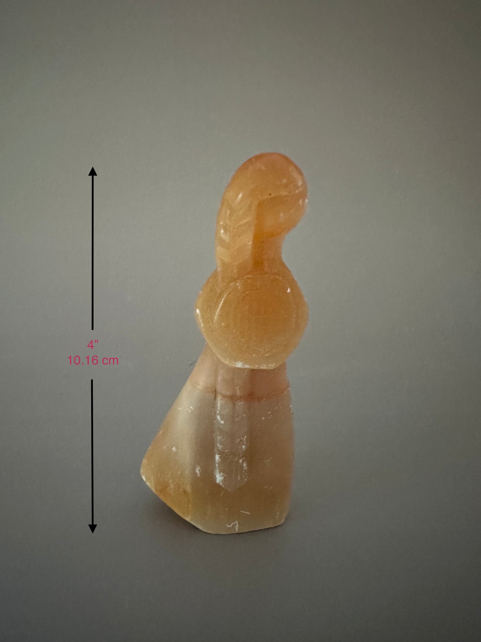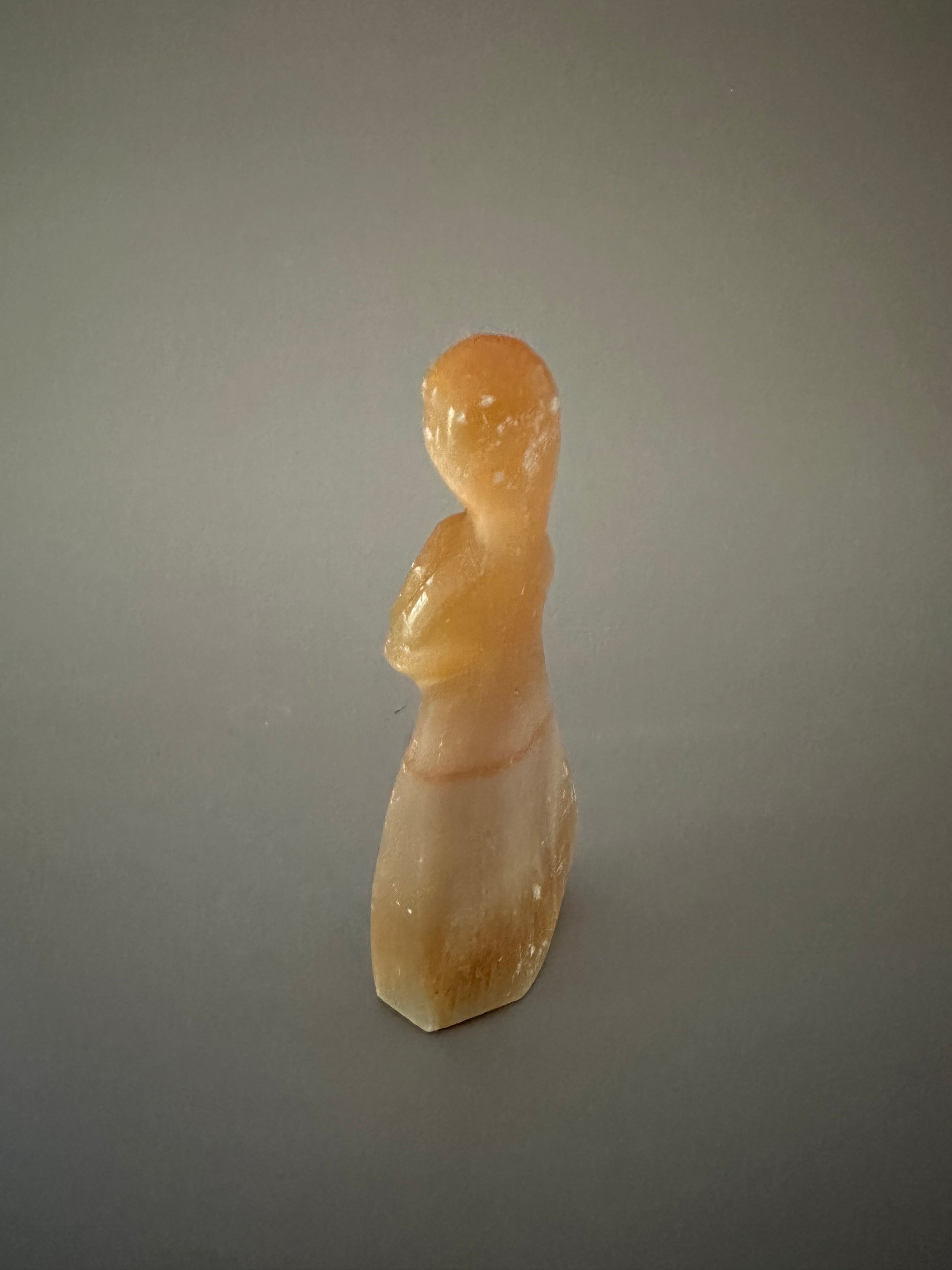This vintage figure, carved from natural selenite stone, depicts a stylized girl in a flowing form. The translucent amber tones of the stone shift with the light, highlighting its smooth texture and subtle veining. Lovingly worn with minor scuffs that add to its vintage character, this piece includes handwritten ink markings and a Russian price sticker on the base, dating it to 1976.