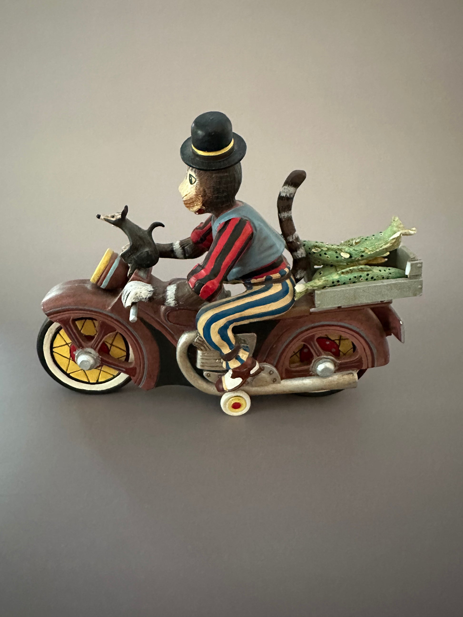 This imaginative figure depicts a cat in a bowler hat riding a vintage-style motorcycle, with a rat perched at the handlebars. A crate on the back holds a small group of removable fish, adding playful versatility. Hand-painted composite with folk-art detail—an eye-catching collectible and display piece.